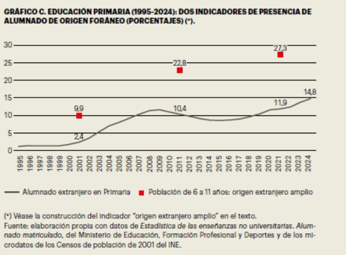 Como señala Juan Carlos Rodríguez en el texto mencionado, “no es descartable que en 2025 el alumnado de origen extranjero se acerque ya a un tercio de la población de 6 a 11 años”.